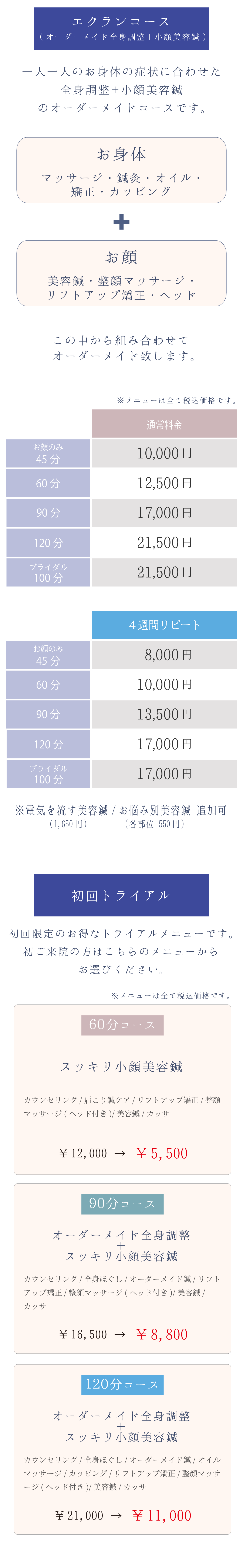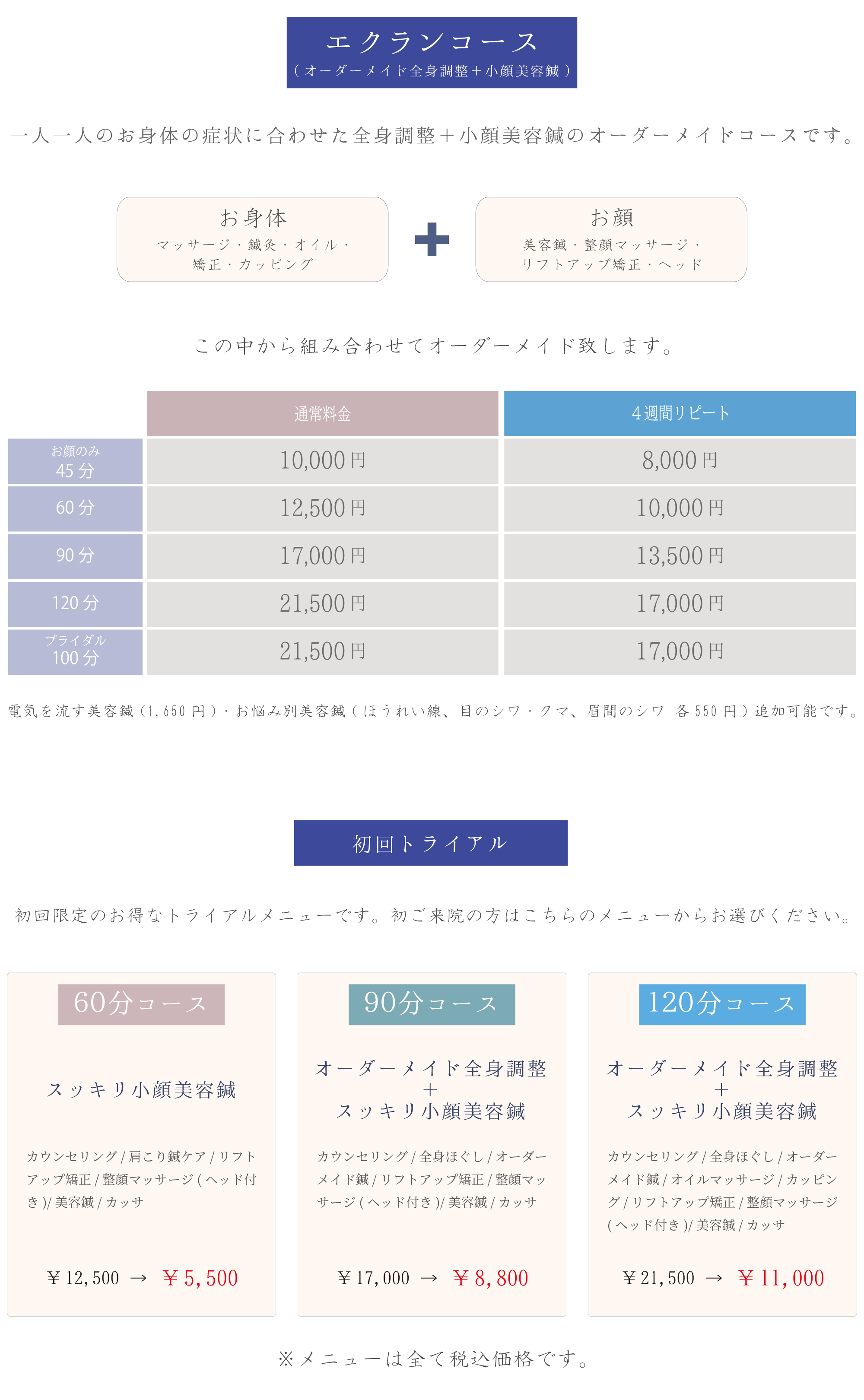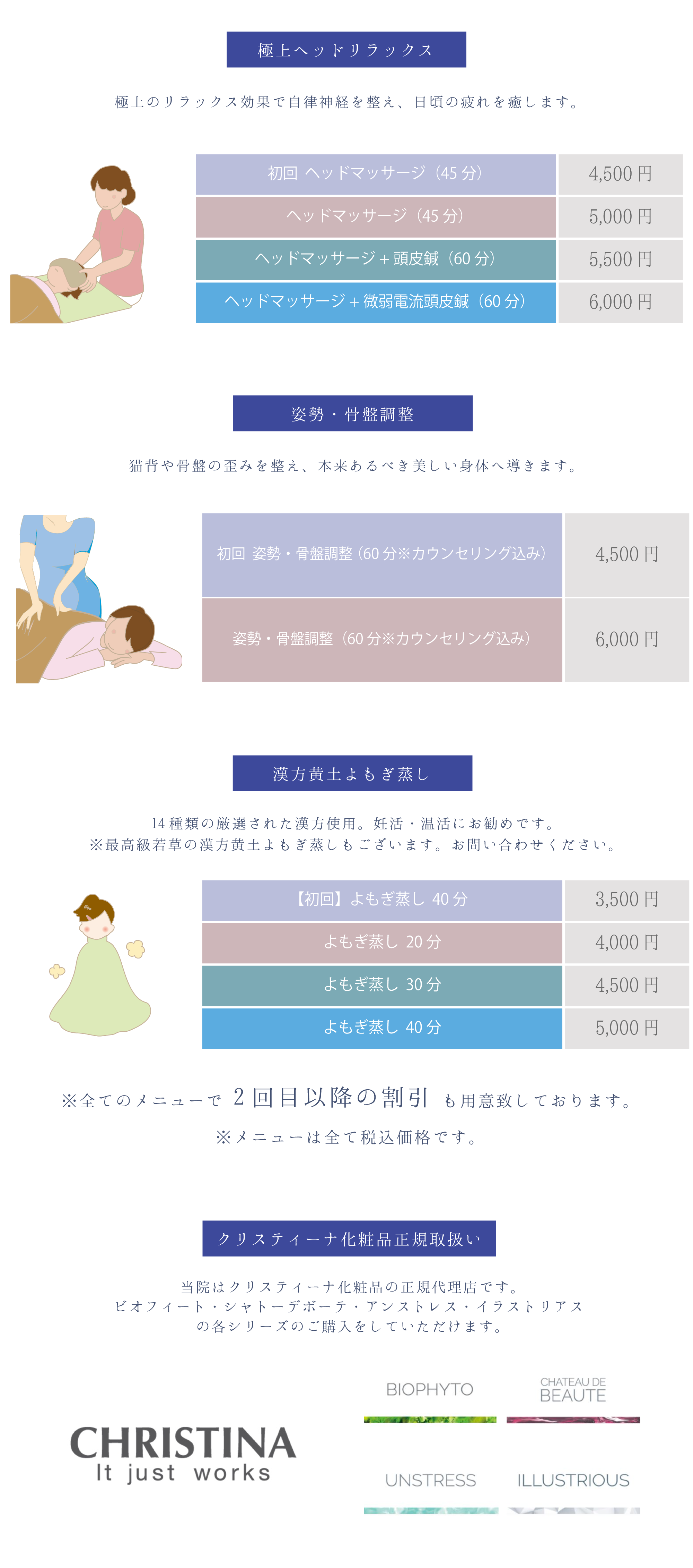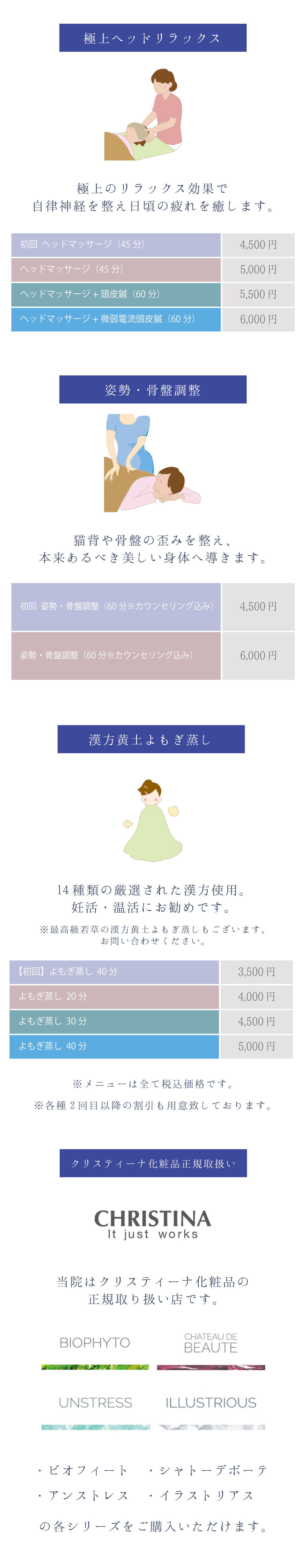 「美しさは健康の上に成り立つ」という信念のもと、お顔・お身体の全身調整という形で健康美を目指します。