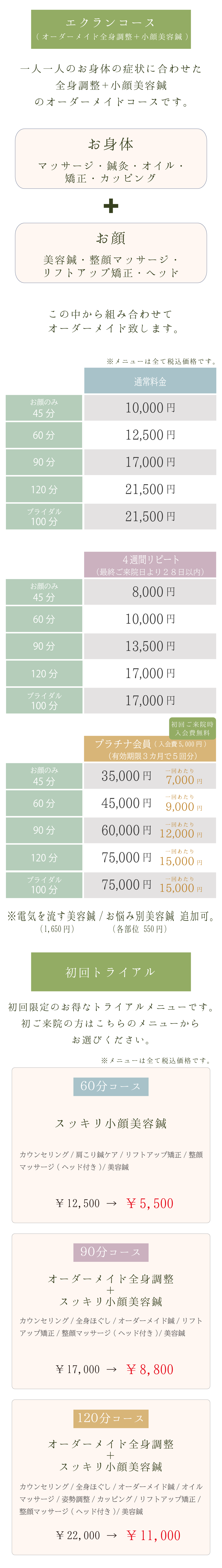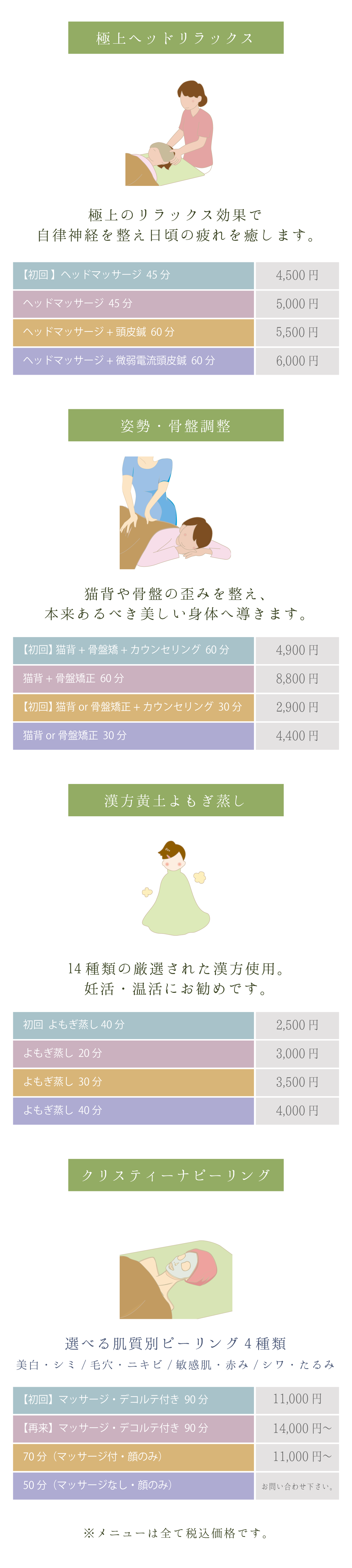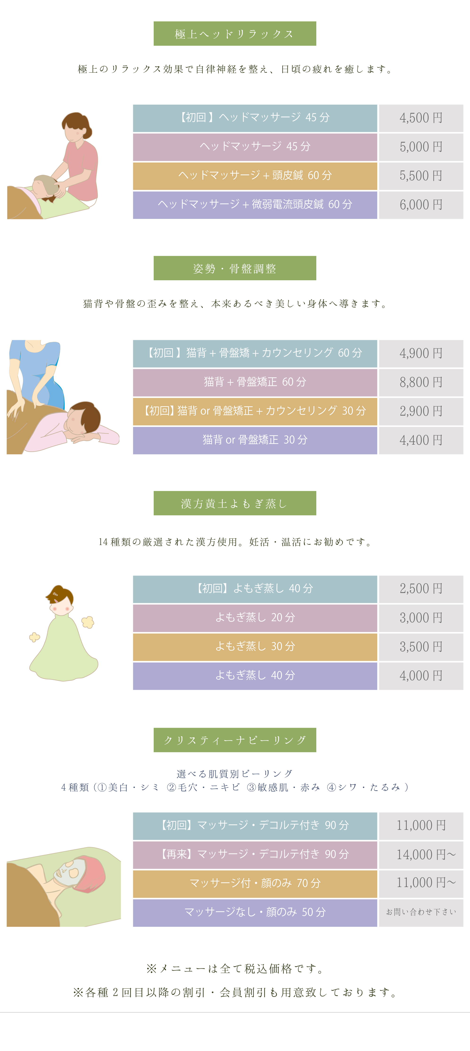 指圧・オイル・姿勢骨盤調整・黄土漢方よもぎ蒸し等の様々な施術から自由に組み合わせ可能なので、